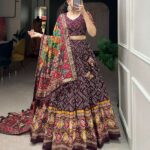 Elegant Tussar Silk Lehenga Set featuring vibrant Patola print with foil work. Includes a stitched lehenga with can-can, unstitched blouse, and printed dupatta. Perfect for festive and wedding occasions.